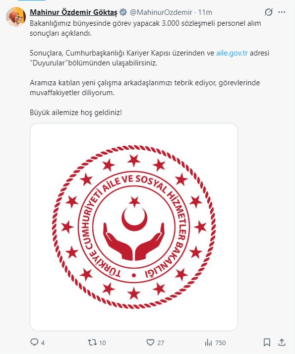 Aile ve Sosyal Hizmetler Bakanı Mahinur Özdemir Göktaş, konuya ilişkin yaptığı açıklamada, "Bakanlığımız bünyesinde görev yapacak 3.000 sözleşmeli personel alım sonuçları açıklandı. Sonuçlara, Cumhurbaşkanlığı Kariyer Kapısı üzerinden ve https://aile.gov.tr adresi "Duyurular"bölümünden ulaşabilirsiniz. Aramıza katılan yeni çalışma arkadaşlarımızı tebrik ediyor, görevlerinde muvaffakiyetler diliyorum. Büyük ailemize hoş geldiniz!" ifadelerine yer verdi.