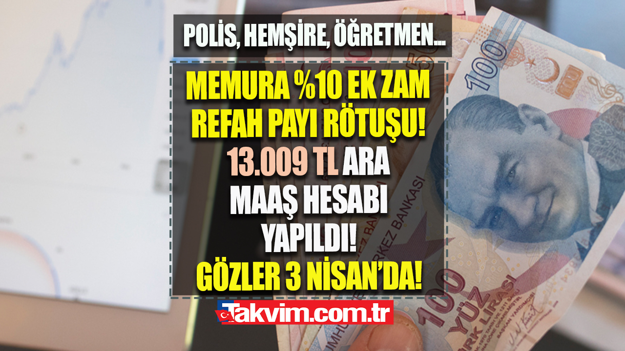 Emeklilere yapılan yeni maaş zammı ile 5.500 TL olan taban aylıklar 7.500 TL'ye yükseltildi. Bu gelişmelerle birlikte gözler asgari ücrete ilave zam ve memura refah payı düzenlemesine çevrildi. Kamu kurumlarında çalışan vatandaşlar sıklıkla, "Memur maaşlarına ek zam gelecek mi?" sorusuna yanıt aramaya başladı. Öte yandan gözler 3 Nisan'da açıklanacak enflasyon rakamlarına çevrildi. Böylelikle emekli memur zammı için 3. veri belli olmuş olacak. Ocak ve Şubat enflasyon farkı yüzde %9,8 olurken, memurun alacağı en düşük maaş şimdiden 13.000 TL'ye ulaştı. Peki, memurlara ara zam yapılacak mı? Temmuzda emekli memur maaşları kaç TL olacak? İşte detaylar...