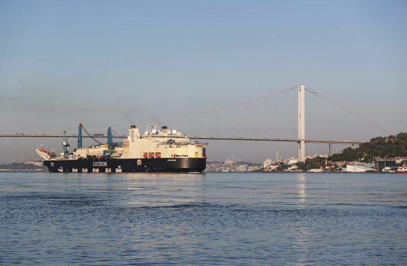 Karadeniz'deki 540 milyar metreküplük doğal gazı taşıyacak boruları derin deniz tabanına yerleştirecek "Castorone" adlı gemi, Zonguldak'ın Çaycuma ilçesine bağlı Filyos beldesi açıklarına ulaştı.