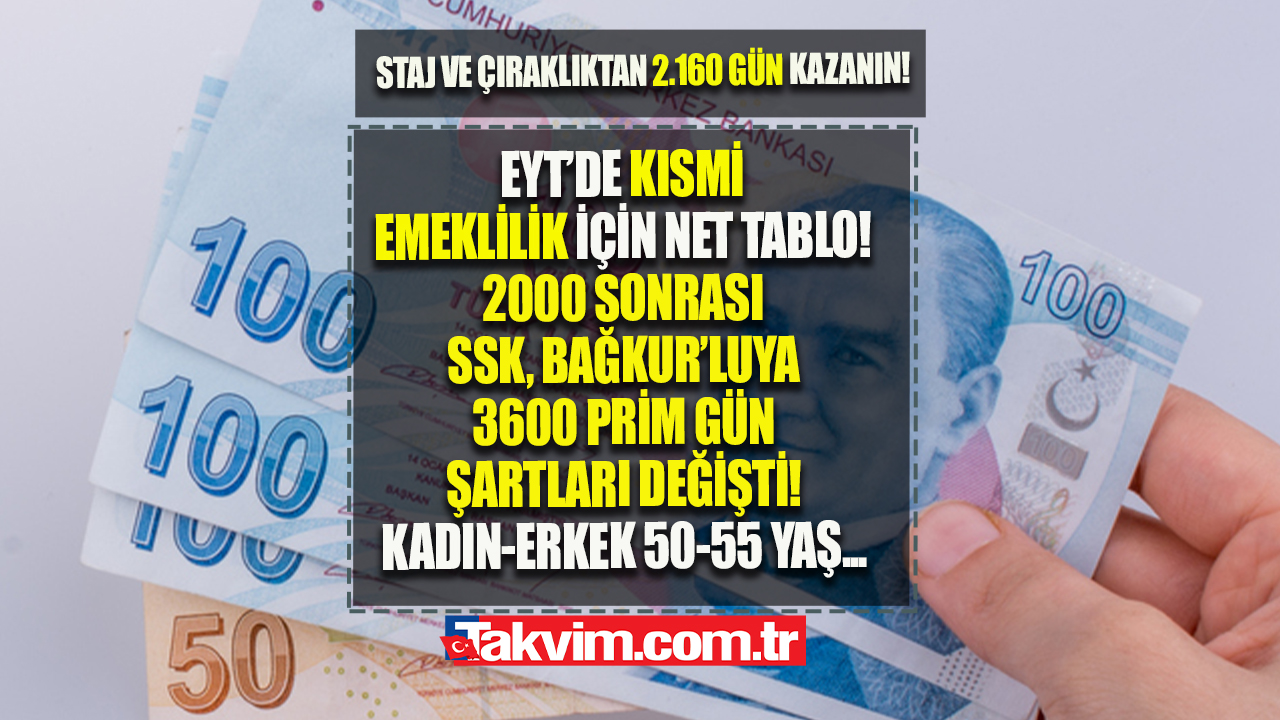 EYT yasasıyla beraber 4 milyonu aşkın kişi emeklilik hakkı elde etti. EYT'yi az farkla kaçıranlar veya 2000 sonrası sigortalı olanlar için 3600'den yani kısmi olarak emekli olma şansı tanınıyor. Yeni Meclis ile birlikte kısmi emeklilikte yeni şartların getirilmesi bekleniyor. Mevcut şartlarda 10-15 yıl sigortalılık ve 3600 prim günü yer alıyor. Öte yandan EYT'yi primle kaçıranlar ise borçlanma yoluyla bu fırsattan yararlanabiliyor. Özellikle anneler doğum borçlanması hakkını kullanabiliyor. Bunda önemli bir ayrıntı da bulunuyor. Staj ve çıraklık sigortasıyla 2.160 gün kazanabiliyor. İşte emekliliğe dair tüm merak edilenler...