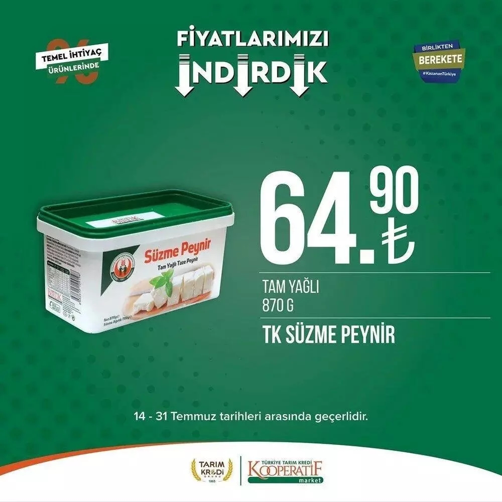 Tarım Kredi Kooperatif marketleri, yeni aktüel ürünler kataloğunu yayınladı! Her ay market alışverişi yapmak isteyenlere yönelik sunduğu avantajlı ürün ve hizmetleriyle vatandaşların ihtiyaçlarına çözüm sunmaya devam eden Tarım Kredi Kooperatif marketleri 31 Temmuz 2023 tarihine kadar geçerli yeni indirimlerini duyurdu. Güncel yayınlanan aktüel ürünler kataloğunda, ayçiçek yağı, deterjan,yoğurt, peynir,bal, un ve diğer gıda ürünleri gibi birçok farklı kategoride ürünler yer alıyor. İşte 24-31 Temmuz 2023 fiyat listesi.
