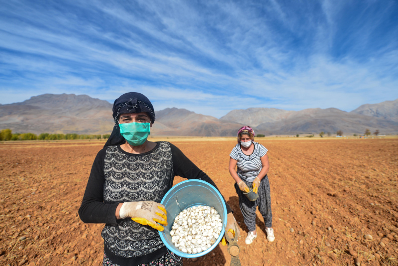Kadınlar, Paşadüzü köyü mevkisindeki 20 dekarlık alanda çapalar yardımıyla kıska, tohum ve dişcikleri, açtıkları çukurlara koyarak üzerlerini toprakla örtüyor.