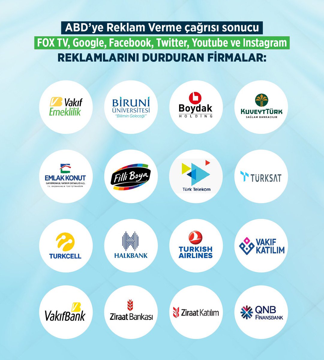 ABD'nin Ajan Brunson üzerinden Türkiye'ye gerçekleştirdiği saldırılar sonucu kenetlenen ve dik bir duruş sergileyen iş dünyası, ABD propogandası yapan siyonist, islam düşmanı FOX TV'ye ve ABD şirketlerine reklam vermeyi kesti.