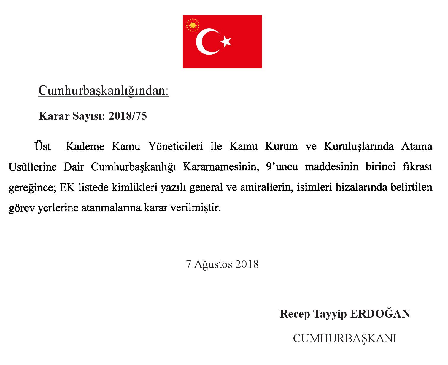 Cumhurbaşkanı Recep Tayyip Erdoğan'ın imzasıyla kuvvet komutanlıklarında yapılan görev değişikliklerine ilişkin kararlar Resmi Gazete'de yayımlandı. İHA'nın haberine göre Kara Kuvvetleri Komutanlığında 74, Deniz Kuvvetleri Komutanlığında 25, Hava Kuvvetleri Komutanlığında 22 olmak üzere toplamda 121 general ve amiralin yeni görev yeri belli oldu.