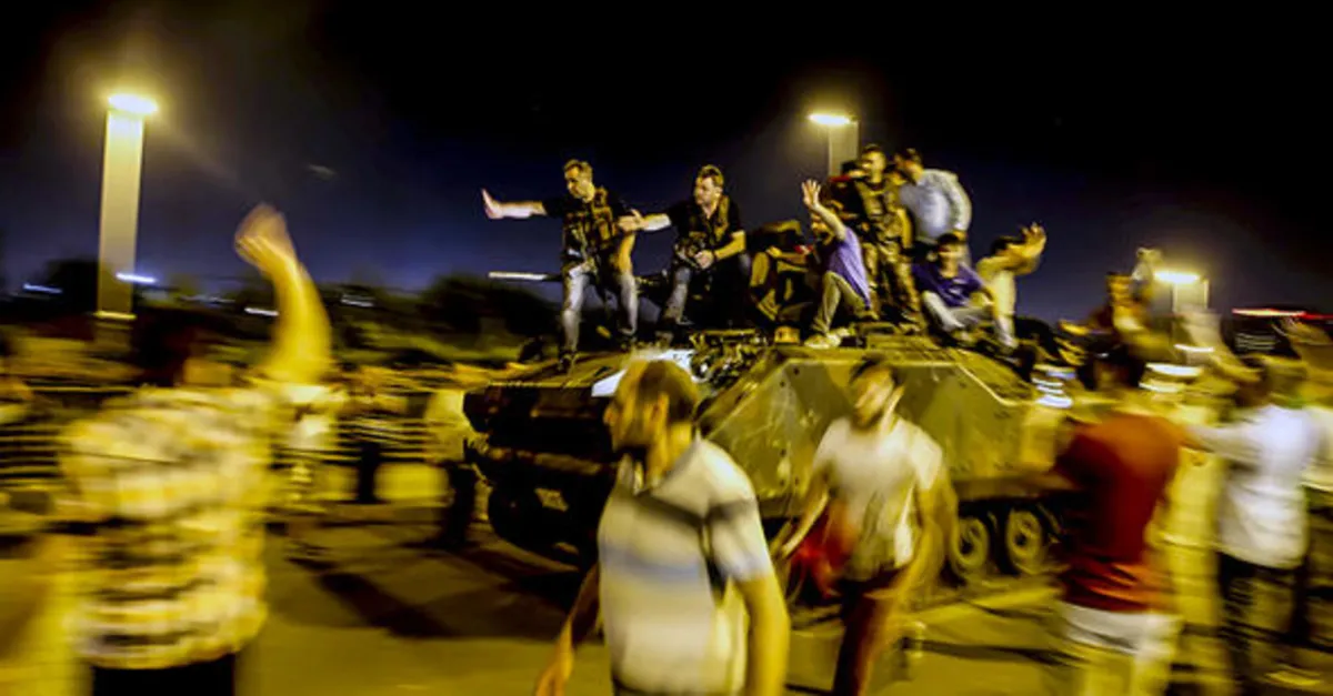Fotoğrafta Cumhurbaşkanlığı Külliyesi önünde askeri araçlara müdahale eden vatandaşlar görülüyor.
