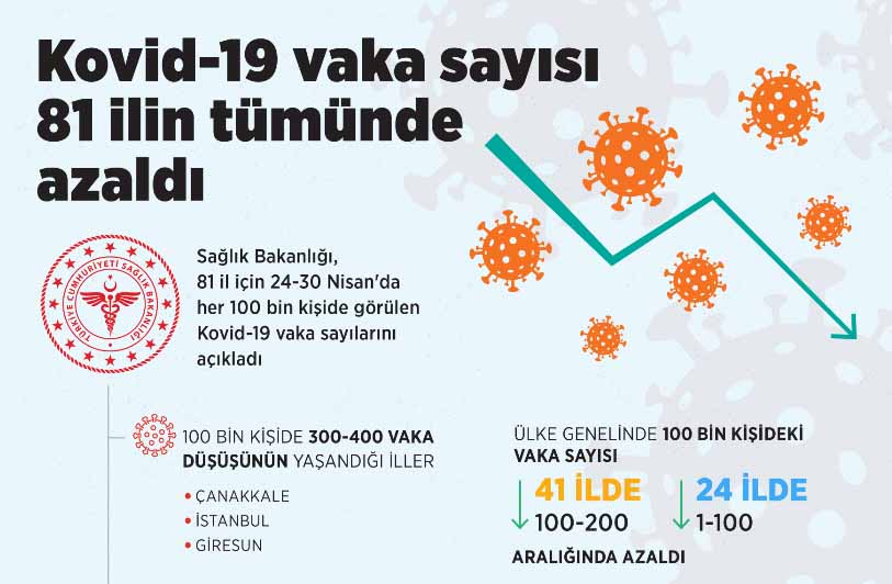 Sağlık Bakanlığının açıkladığı 24-30 Nisan'ı kapsayan verilere göre, her 100 bin kişideki Kovid-19 vaka sayısı bir önceki haftaya oranla tüm illerde azaldı.