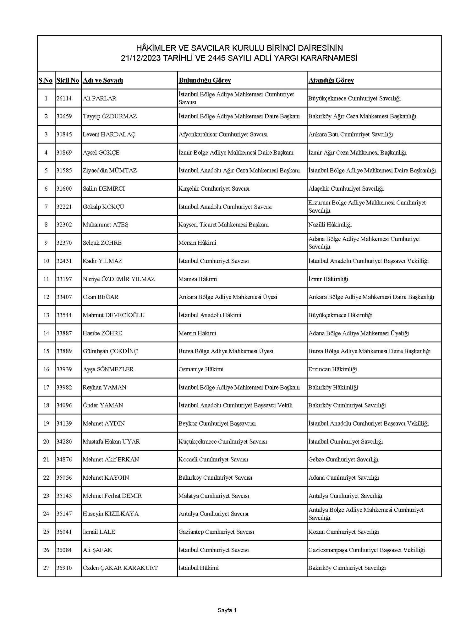 İstanbul Bölge Adliye Mahkemesi Daire Başkanı Tayyip Özdurmaz Bakırköy Ağır Ceza Mahkemesi Başkanlığına, İzmir Bölge Adliye Mahkemesi Daire Başkanı Aysel Gökçe İzmir Ağır Ceza Mahkemesi Başkanlığına, İstanbul Anadolu Ağır Ceza Mahkemesi Başkanı Ziyaeddin Mümtaz İstanbul Bölge Adliye Mahkemesi Daire Başkanlığına, İstanbul Cumhuriyet Savcısı Kadir Yılmaz İstanbul Anadolu Cumhuriyet Başsavcıvekilliğine, İstanbul Bölge Adliye Mahkemesi Daire Başkanı Reyhan Yaman Bakırköy hakimliğine atandı.