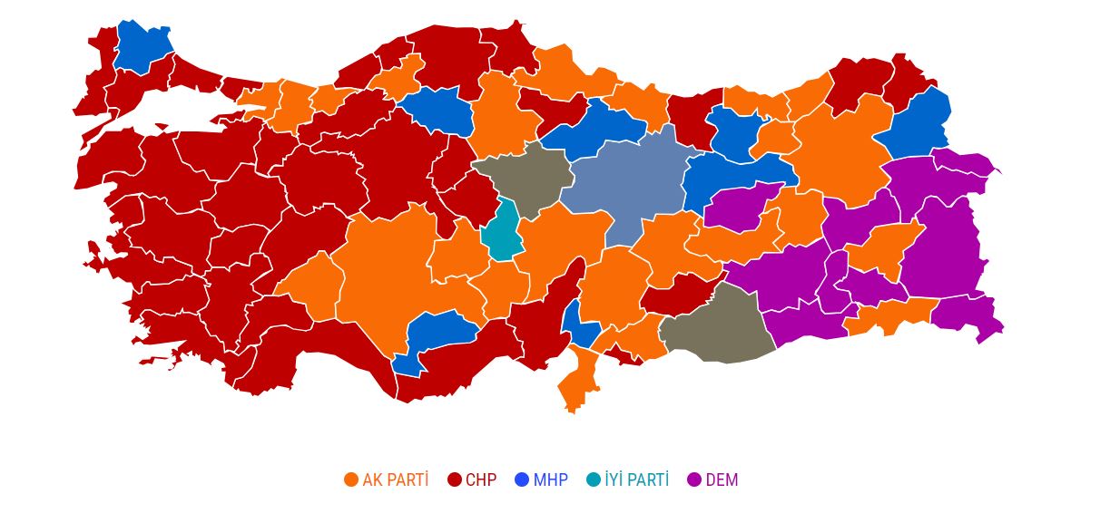 Türkiye dün yeni yerel yöneticilerini seçmek için sandık başına gitti. Seçimlerde, kesin olmayan Türkiye geneli sonuçlarına göre, CHP 35, AK Parti 24, DEM Parti 10, MHP 8, Yeniden Refah Partisi 2, BBP 1, İYİ Parti 1 belediye başkanlığı kazandı.