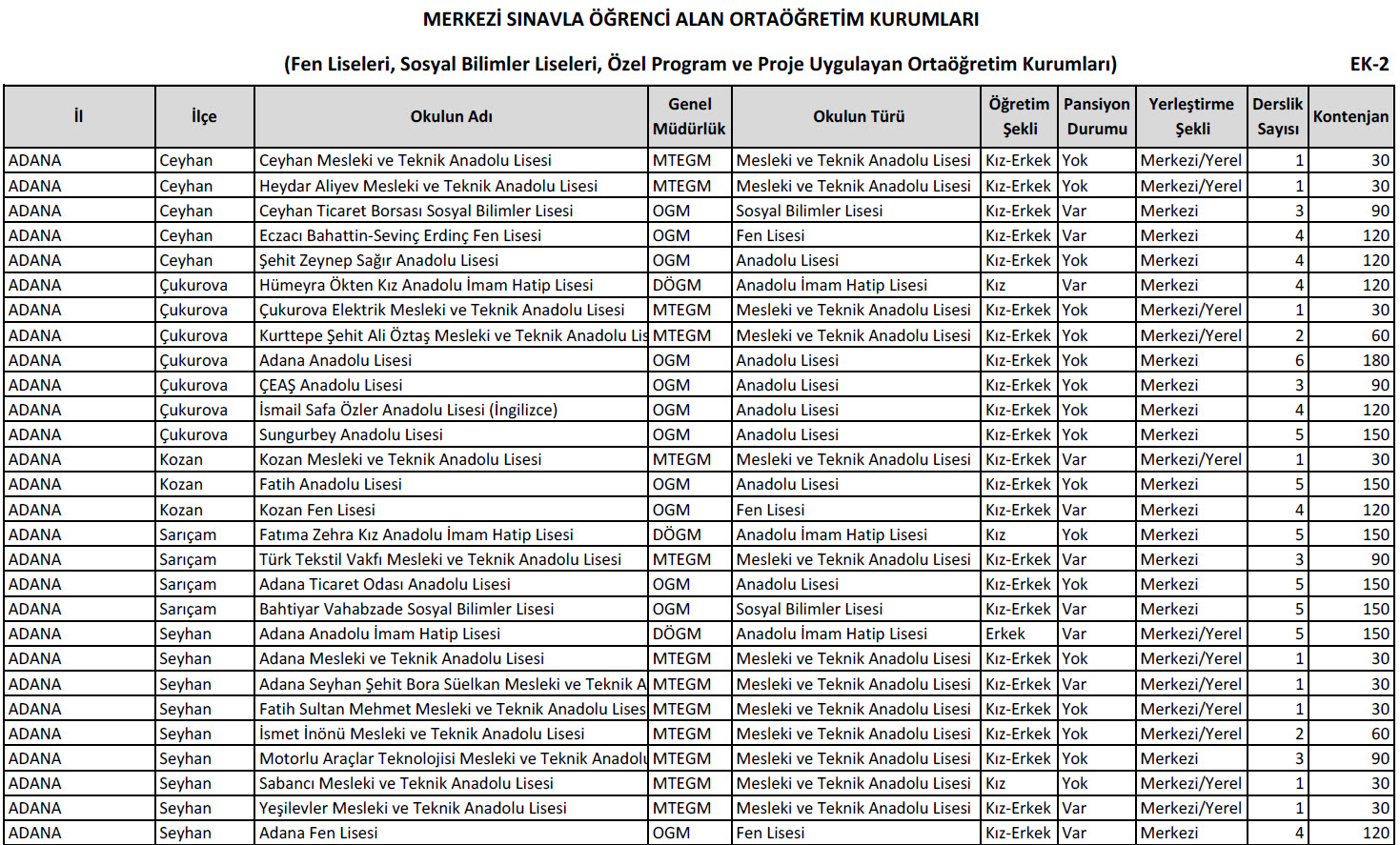 MEB, 8'inci sınıf öğrencilerinin 2 Haziran'da isteğe bağlı gireceği merkezi sınavla öğrenci alacak okulları ve kontenjanları açıkladı. Merkezi Sınava katılmak isteyenler, başvurularını 11-18 Nisan 2018 tarihleri arasında elektronik ortam üzerinden öğrenim gördükleri okullara yapacak. İşte MEB'in açıkladığı liste: