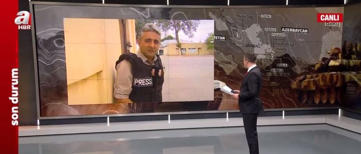 Dağlık Karabağ Operasyonu'nun 8. Gününde cephe hattına neler oluyor? A Haber yurt haberler müdürü Kerim Ulak, canlı yayında dün bölgede Türk gazetecilerin hedef alındığı bölgeyi gösterirken canlı yayında bomba sesleri duyuldu. Panik anları böyle görüntülendi.