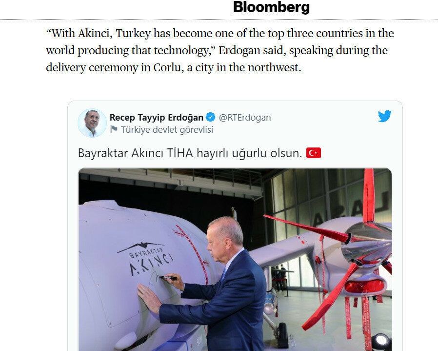 Türkiye, insansız hava araçlarında gücüne güç katmaya devam ediyor. Başkan Recep Tayyip Erdoğan, dün Çorlu'da Baykar Akıncı Taarruzi İnsansız Hava Aracı'nın (TİHA) Türk Silahlı Kuvvetleri'ne (TSK) teslimat törenine katıldı. ABD basınından Bloomberg, törenin ardından havalanan Akıncı TİHA'yla ilgili gelişmeyi okurlarına aktardı.