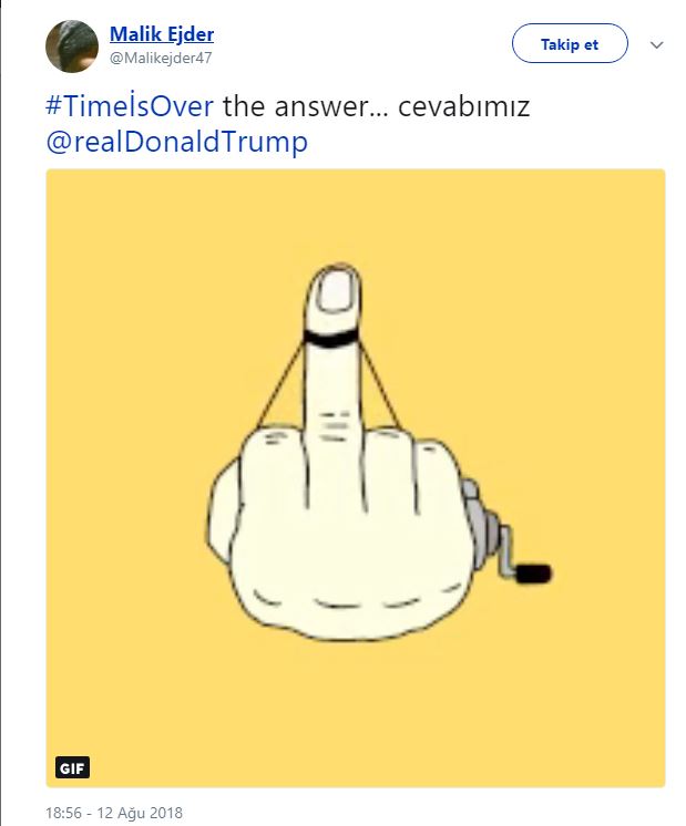 #Timeisover tabelası üzerinden yürüyen sosyal medya kampanyasında vatandaşlar papaz Brunson'un tehdit edilmesi üzerinden Türkiye'ye yöneltilen tehditlere cevap verdiler...