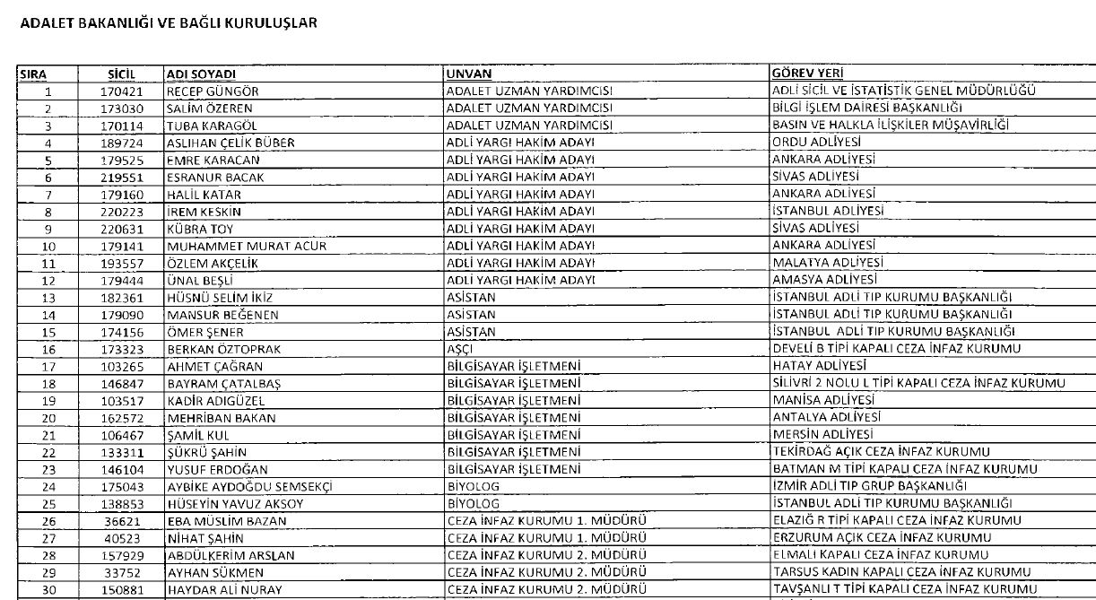 Adalet Bakanlığı ve bağlı bulunan kuruluşlardan aralarında hakim adayı ve infaz koruma memurlarının da bulunduğu bin 52 kişi ihraç edildi.