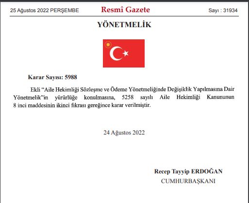 Cumhurbaşkanı Recep Tayyip Erdoğan'ın imzasıyla yayımlanan 'Aile Hekimliği Sözleşme ve Ödeme Yönetmeliğinde Değişiklik Yapılmasına Daire Yönetmelik' Resmi Gazete'nin bugünkü sayısında yayımlandı.