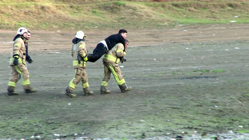 Uzun süre çamurun içinde kaldığı için yürümekte zorluk çeken Emre Yılmaz'ı ambulansa götürmek için itfaiye ekipleri yoğun çaba harcadı. Ayakta durmakta zorlanan genci bir itfaiye eri sırtına aldı. Dakikalarca Yılmaz'ı sırtında taşıyan itfaiyeci kıyıya getirdiği genci sağlık ekiplerine teslim etti. İlk müdahalesi ambulansta yapılan Yılmaz, tedbir amaçlı hastaneye götürüldü.