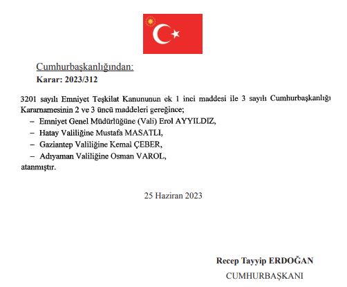 Son dakika haberleri.. Resmi Gazete'de atama kararları yayımlandı. Emniyet Müdürlüğü'ne Erol Ayyıldız atandı. Öte yandan Hatay Valiliğine, Mustafa Masatlı, Gaziantep Valiliğine Kemal Çeber, Adıyaman Valiliğine Osman Varol atandı.