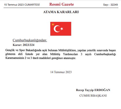 İçişleri Bakanlığı Vali-Mülkiye Başmüfettişliklerine İsmail Çataklı ve Mahmut Çuhadar, Türkiye Raylı Sistem Araçları Sanayii AŞ Genel Müdürlüğünde açık bulunan Yönetim Kurulu Üyeliklerine İrfan İpşir, Ömer Abdullah Karagözoğlu, Murat Baştor, ve Enver Mamur atandı.