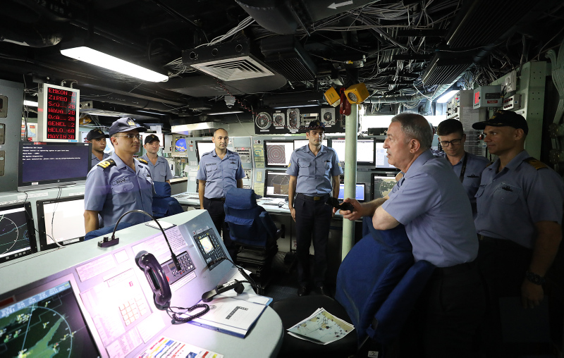 Helikopterle Yavuz sondaj gemisine refakat eden TCG Gemlik fırkateynine giden Akar ve TSK'nın komuta kademesi, faaliyetlere ilişkin deniz taktik resmi üzerinden brifing aldı, talimatlar verdi.