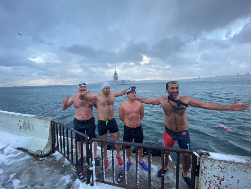 Sıcaklıkların eksi seviyeye ulaştığı kentte soğuğa aldırış etmeyen, 'Sarayburnu Fatihleri' adını verdikleri bir grup vatandaş, Üsküdar Salacak Sahili'nden denize atladı. Suya atlayan vatandaşlar, kar yağışı altında dakikalarca yüzdü. Kız Kulesi'ne karşı buz gibi havada boğazda yüzen vatandaşlar renkli görüntüler oluşturdu.