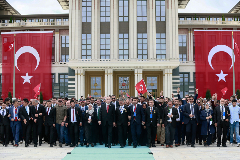 Erdoğan, 15 Temmuz Demokrasi ve Milli Birlik Günü dolayısıyla düzenlenen program kapsamında Cumhurbaşkanlığı Külliyesi önünde kendisini bekleyen 15 Temmuz şehitlerinin yakınları ve gazilerle bir süre sohbet etti.