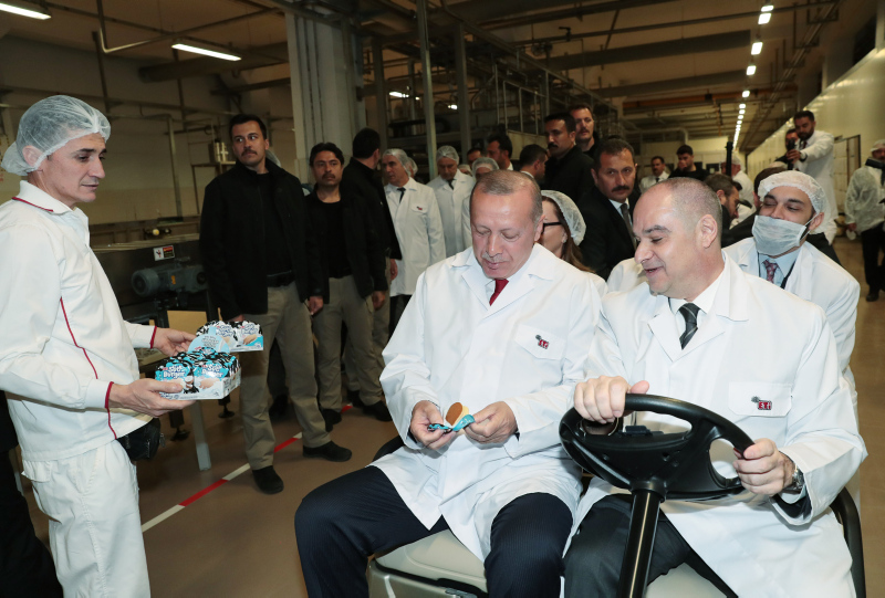 Fabrikadaki çalışmalar hakkında ETİ Gıda ve ETİ Makine Yönetim Kurulu Başkanı Ahmet Firuzhan Kanatlı'dan bilgi alan Cumhurbaşkanı Erdoğan, işçilerle de bir süre sohbet etti.