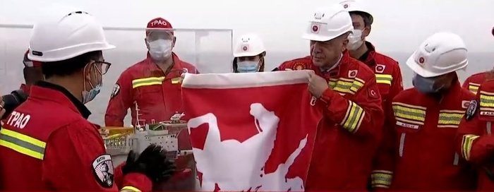 Fatih gemisinin rezerv keşfi dolayısıyla, Cumhurbaşkanı Erdoğan'a Osmanlı'da zafer kazanan donanma gemilerine asılan sancak hediye edildi.