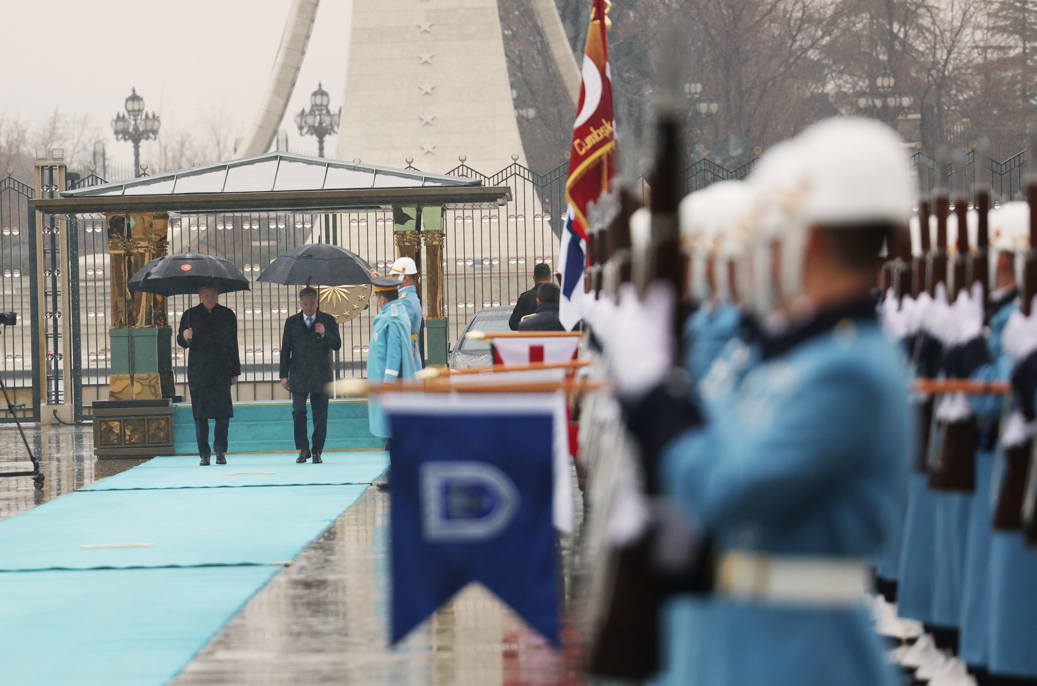 Erdoğan ve Niinistö'nün tören alanındaki yerlerini almasının ardından 21 pare top atışı eşliğinde iki ülke milli marşları çalındı.