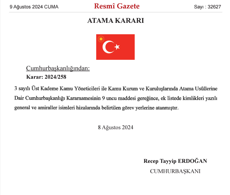 Kara, Deniz ve Hava Kuvvetleri komutanlıklarına bağlı 187 general ve amiralin atama kararları Resmi Gazete'de yayımlandı.
