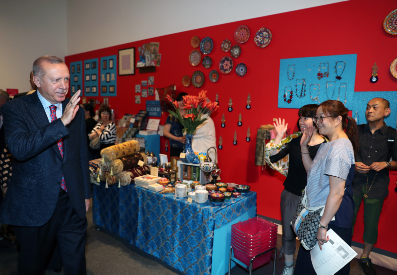Müzeye gelişinde Altes Prenses Akiko tarafından karşılanan Erdoğan, kendisini bekleyen vatandaşları selamladı.