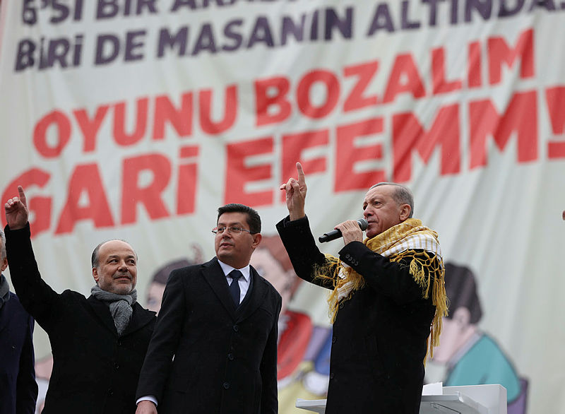 Alana asılan "Önce Yassıada'da şimdi masada 6'sı bir arada biri de masanın altında. Oyunu bozalım gari Efem." yazılı pankartı okuyan Erdoğan, alandakilere, "Efeler, oyunu bozmaya hazır mıyız?" diye sordu.