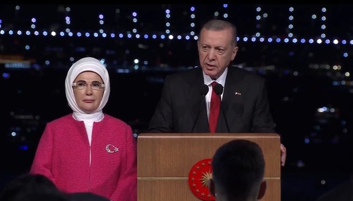 Başkan Erdoğan, konuşmasının ardından 'Türkiye Yüzyılı' butonuna bastı, İstanbul Boğazı'nda havai fişek ve dron gösterisi başladı.