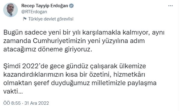 Erdoğan paylaşımında, "Sadece 2022'de yaptığımız eser ve hizmetlerin özeti bile saatlere, günlere sığmıyor… Cumhuriyetimizin 100'üncü yılında inşallah daha nice hizmet ve proje ile milletimizin huzurunda olacağız. #TürkiyeYüzyılı'nı hep birlikte adım adım tarihe kazandıracağız." ifadelerini kullandı.