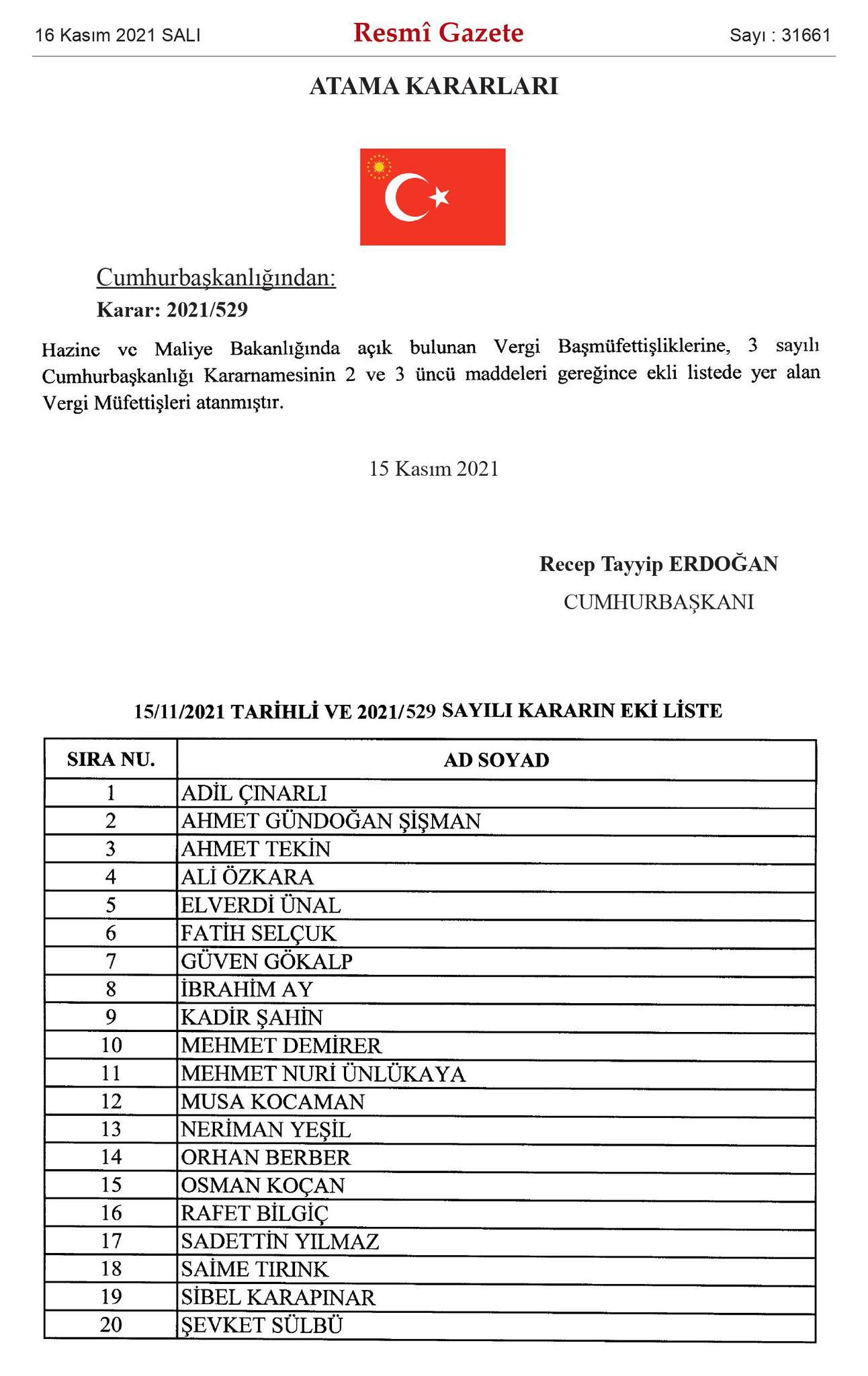 Başkan Recep Tayyip Erdoğan'ın imzasıyla yayımlanan Resmi Gazete'nin bugünkü sayısında atama kararları da yer aldı. Buna göre Hazine ve Maliye Bakanlığında açık bulunan Vergi Başmüfettişliklerine, Vergi Müfettişleri atandı. İşte Hazine ve Maliye Bakanlığına yapılan o atamalar...