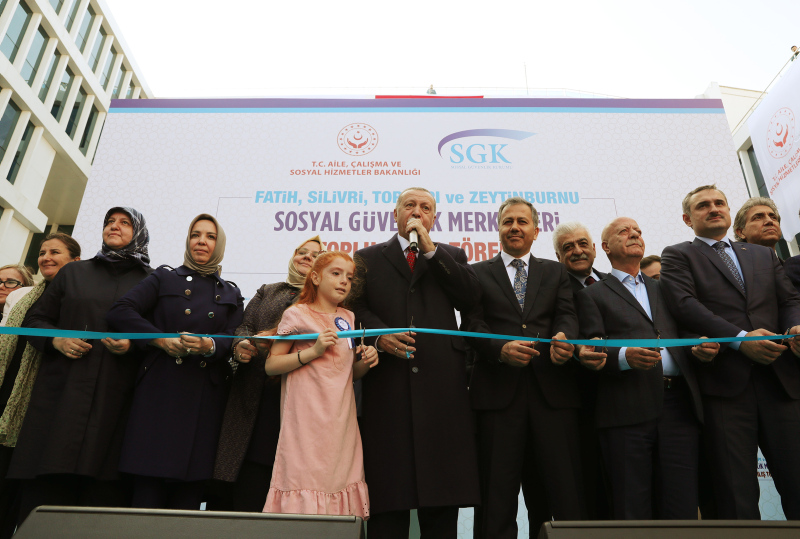 Başkan Recep Tayyip Erdoğan ile Aile, Çalışma ve Sosyal Hizmetler Bakanı Zehra Zümrüt Selçuk (sol 2), Sosyal Güvenlik Kurumu (SGK) Topkapı kampüsünde düzenlenen Fatih, Silivri, Topkapı ve Zeytinburnu sosyal güvenlik merkezleri toplu açılış törenine katıldı.