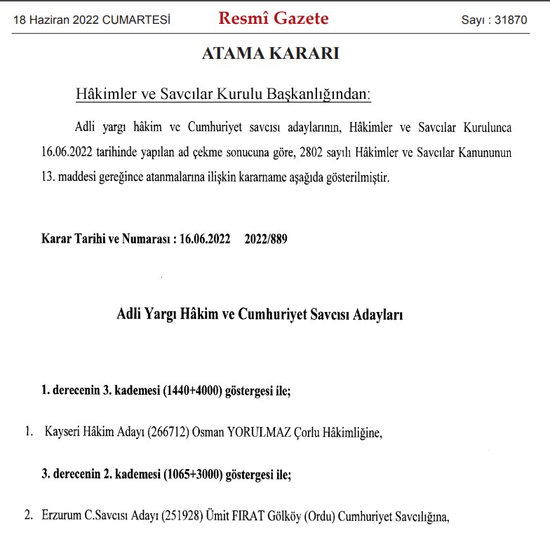 Resmi Gazete'de yayımlanan atama kararına göre, 95 adli yargı hakim ve cumhuriyet savcısı adayı, 16 Haziran 2022'de yapılan ad çekme sonucunda HSK tarafından atandı.