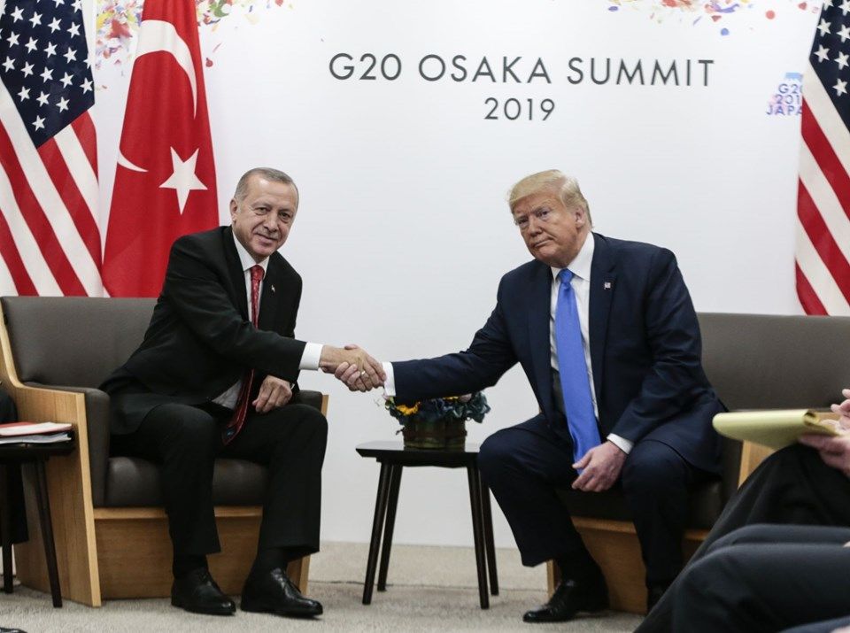 Cumhurbaşkanı Recep Tayyip Erdoğan'ın G20 Liderler Zirvesi kapsamında INTEX Osaka Fuar Merkezi'nde ABD Başkanı Donald Trump ile görüşmesi TSİ 07.14'te başladı, 07.50'de sona erdi.