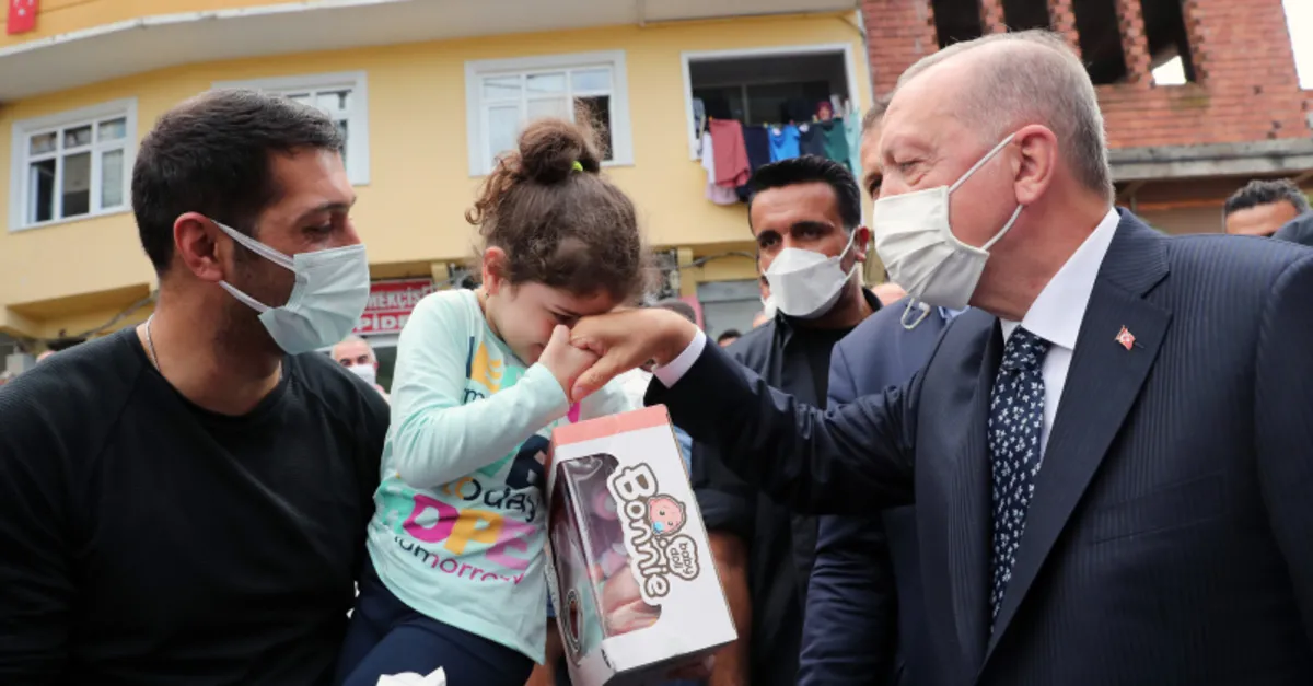 Bir yaşlı kadın Erdoğan'a sarılırken, bir çocuk da Erdoğan'ın elini öptü.