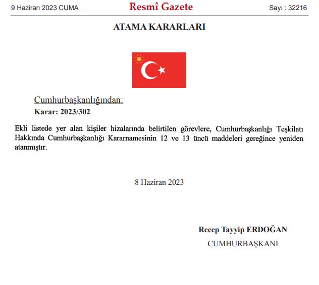 Karara göre, Hukuk ve Mevzuat Genel Müdürü Hakkı Susmaz, Personel ve Prensipler Genel Müdürü Bilal Şentürk, Güvenlik İşleri Genel Müdürü Yusuf Karaloğlu, Destek ve Mali Hizmetler Genel Müdürü Mehmet Tuncer, Koruma Hizmetleri Genel Müdürü Ramazan Bal yeniden aynı göreve atandı.