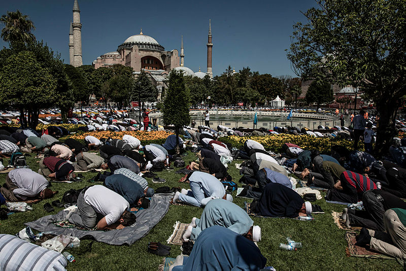 Başkan Erdoğan Ayasofya'da Kur'an-ı Kerim okudu. 4 minareden 4 müezzinin ezan sesleri yükseldi. Diyanet İşleri Başkanı Ali Erbaş ise, "Ayasofya: Fethin nişanesi, Fatih'in emaneti" başlıklı hutbesini okumak için minbere kılıçla çıktı.