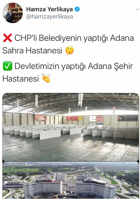 Gençlik ve Spor Bakanlığı Bakan Yardımcısı ve Cumhurbaşkanı Başdanışmanı Hamza Yerlikaya: "CHP'li Belediyenin yaptığı Adana Sahra Hastanesi. Devletimizin yaptığı Adana Şehir Hastanesi. Sizin hayalleriniz, bizim gerçeklerimizdir."