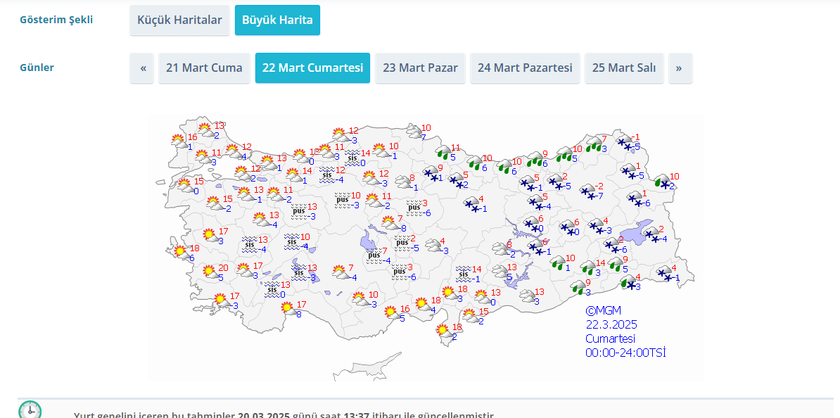 Meteoroloji Genel Müdürlüğü'nün 22 Mart 2025 Cumartesi için paylaştığı son hava durumu haritası, batı bölgelerinde baharın ilk ılık nefesini müjdeliyor. Marmara, Ege ve Batı Akdeniz'de parçalı bulutlu gökyüzü, zaman zaman güneşin yüzünü gösterecek. Sıcaklıkların mevsim normallerinde seyredeceği bu hafta sonunda, açık havada plan yapmak isteyenler için ideal şartlar oluşuyor. Peki diğer bölgelerde hava nasıl olacak? Rüzgar ve nem oranları ne düzeyde? İşte, uzmanlardan hafta sonu için kritik uyarılar ve bölge bölge detaylı analiz…