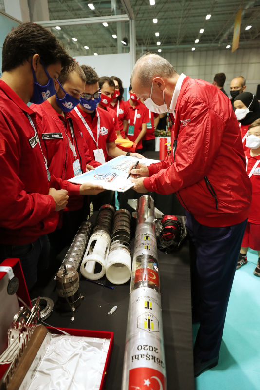 Standları tek tek gezen Erdoğan, yakından ilgilendiği yarışmacıların projeleri hakkında bilgi aldı. Erdoğan, daha sonra hem projeleri hem de ödülleri imzaladı.
