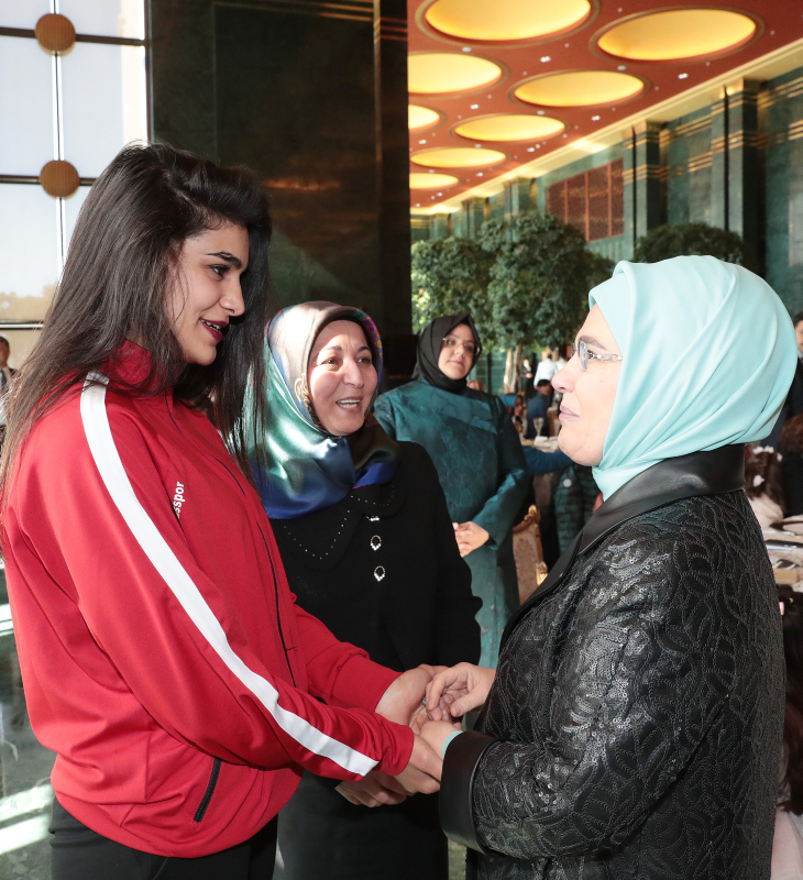 Emine Erdoğan, 8 Mart Dünya Kadınlar Günü etkinlikleri kapsamında koruyucu aileler, devlet koruması altında büyüyen çocuklar, iş insanları, sanatçılar ve gazetecilere Cumhurbaşkanlığı Külliyesi Kış Bahçesi'nde yemek verdi.