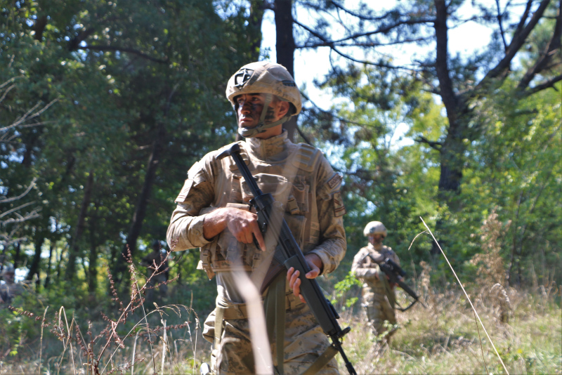 Senaryo gereği teröristlerin bulunduğu bir binaya girecek olan jandarma komandoları ilk önce ormanlık araziden geçiyorlar.