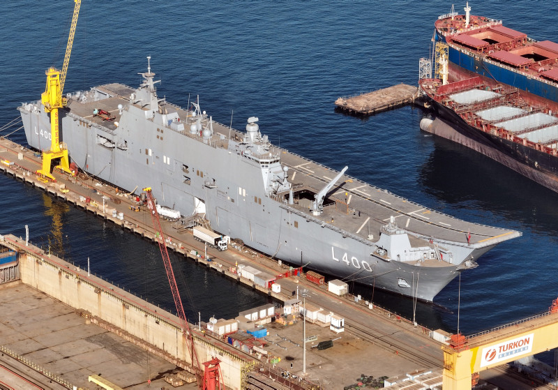 Türk Deniz Kuvvetleri'nin amiral gemisi olacak TCG Anadolu veya Anadolu L-400 isimli amfibik hücum gemisinin son durumu havadan görüntülendi. Büyük bir kısmı tamamlanan 232 metre genişliğindeki gemi tüm heybeti ile görenleri kendine hayran bırakıyor. TCG Anadolu ana yapılandırması bakımından Türkiye'nin amfibi hücum gemisi (LHD) sınıfına giren ilk gemi olma özelliğini taşıyor. 2014 yılında yapımına başlanan geminin çalışmalarında sona gelindi. TCG Anadolu tam donanımlı 8 helikopter bulundurabilecek. Geminin bir tabur tam teşekküllü askerin istenilen bölgeye sevkini sağlayabilme özelliği bulunuyor. Kıtalararası görevlere çıkabilecek elverişliliğe sahip olan geminin aktif olarak Mavi Vatan'ı koruması bekleniyor.