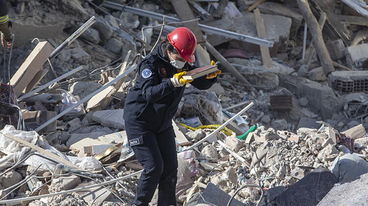 Enkazda çalışma yapan bir arama kurtarma görevlisi, bulduğu Kuran-ı Kerim'i yıkılan binadan çıkardı.