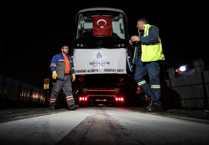Eminönü'nden başlayarak Haliç sahili boyunca ilerleyerek Alibeyköy Otogarı'na ulaşacak şekilde inşa edilen tramvay hattının Balat mevkine, gece saatlerinde tırla bir vagon getirildi.