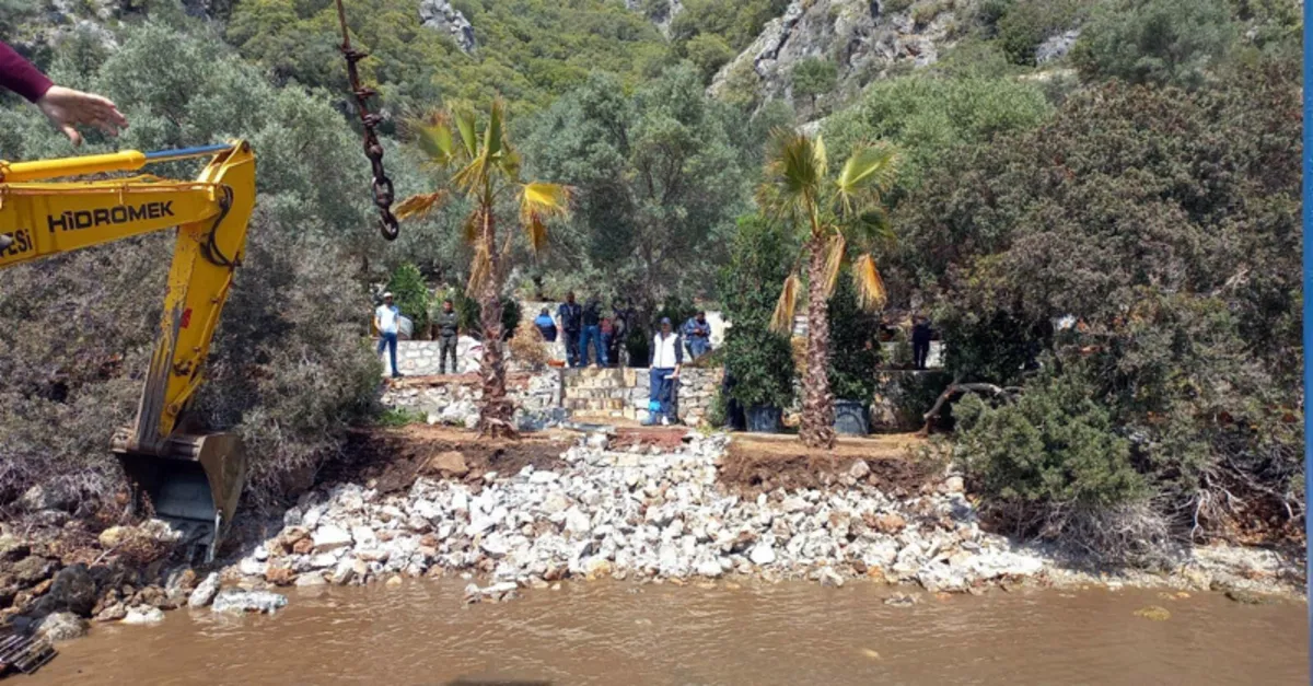 Koydaki kaçak olduğu belirlenen taş duvarlar, seyir terası, tuvalet, fırın ve ahşap ev yıkıldı.