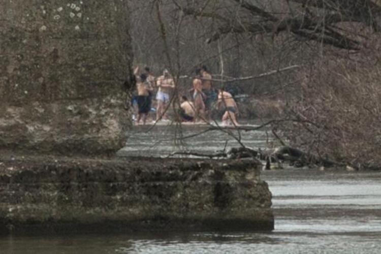 Bu bölgedeki yaklaşık 30 göçmen, soğuk havaya rağmen nehir ortasında oluşan adacıktan suya girip yıkandı.