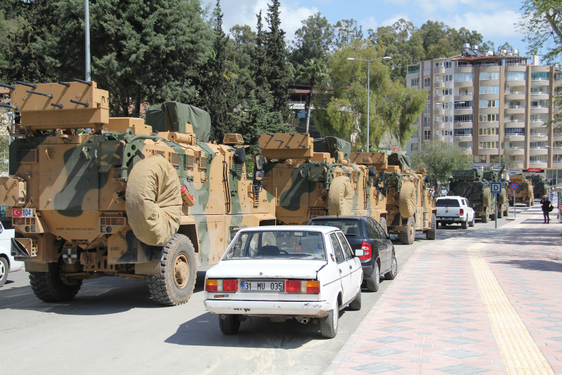 Türk Silahlı Kuvvetleri (TSK) tarafından Suriye sınır hattına gönderilen askeri araçlar, Hatay'ın Kırıkhan ilçesinde gerekli ikmalleri ve yüklemeleri yapıldıktan sonra konvoy halinde yola çıktı.